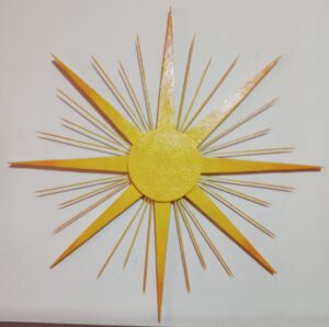 Materiales: Figura de madera de fibrofácil, palitos de madera, pegamento silicona fría, pintura acrílica, barniz.