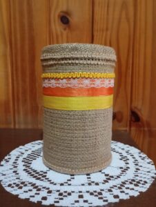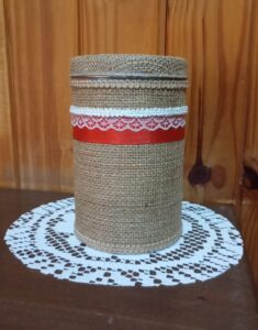Materiales: Lata cilíndrica mediana con tapa, arpillera, pasamanería de yute, pasamanería de seda, cinta falletina Nro 5, puntilla de nylon, adhesivo de doble contacto.