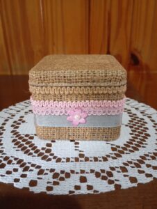 Materiales: Lata cuadrada mediana con tapa, arpillera, pasamanería de yute, pasamanería de seda, cinta falletina Nro 5, puntilla de nylon, flor de tela, perlita, pegamento silicona fría, adhesivo de doble contacto.