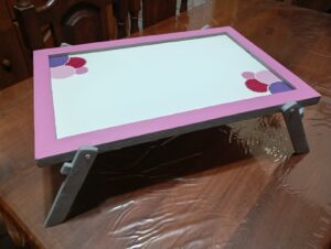 Materiales: Madera de fibrofácil rectangular grande, 4 varas de madera para patas, 4 tornillos, clavos medianos, pintura acrílica, barniz.