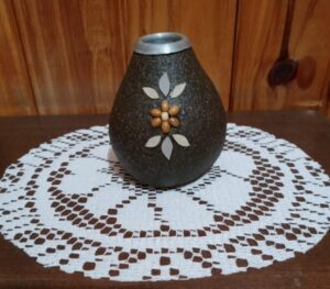 Materiales: Mate de calabaza, arpillera, gemas de bijouterie, hojitas de gamuza, pasamanería de yute, adhesivo de doble contacto, pié de acero inoxidable.
