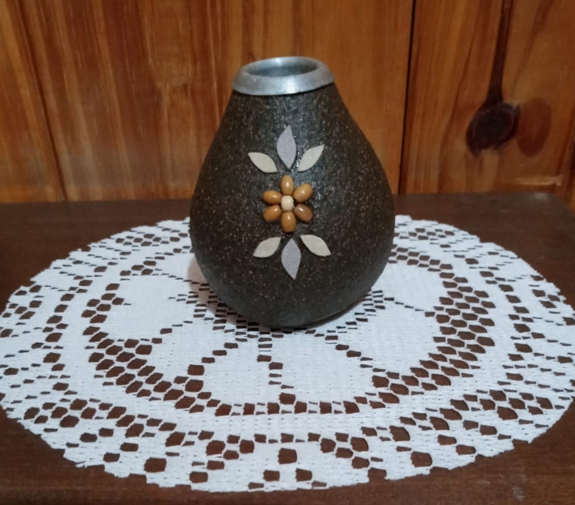 Materiales: Mate de calabaza, cuentas de madera para bijouterie, hojitas de gamuza, pegamento silicona fría, pintura símil piedra.