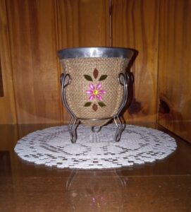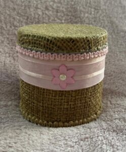 Materiales: Lata cilíndrica mediana con tapa, arpillera, pasamanería de yute, pasamanería de seda, cinta falletina Nro 5, cinta de gasa Nro 2, flor de tela, perlita, pegamento silicona fría, adhesivo de doble contacto.
