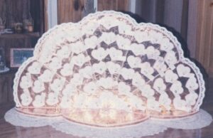Materiales: Telgopor, cartón, papel metalizado, pasamanería de seda, cordón de perlitas, puntillas de papel (blondas para repostería), adhesivo de doble contacto, cola vinílica.