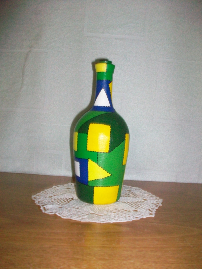 Botella pintada 15 mayo, 2011PintadasMarcia Schütz Botella pintada Pieza: Botella de vidrio mediana. Materiales: Convertidor de óxido, pintura acrílica, corcho, barniz. Técnica: Pintado (imitación Patchwork). Dimensiones: 24 x 13 cm.