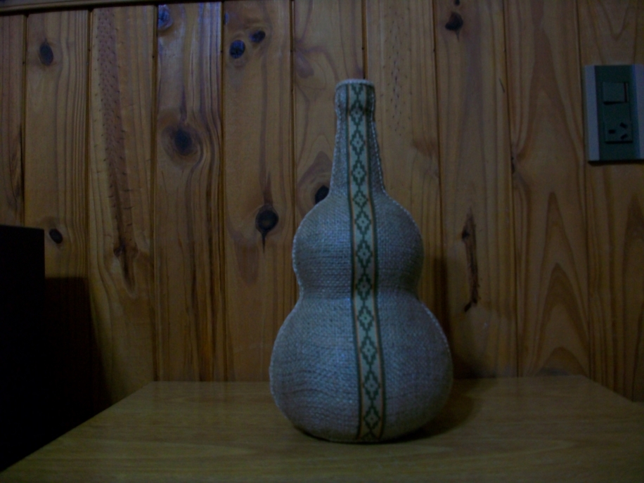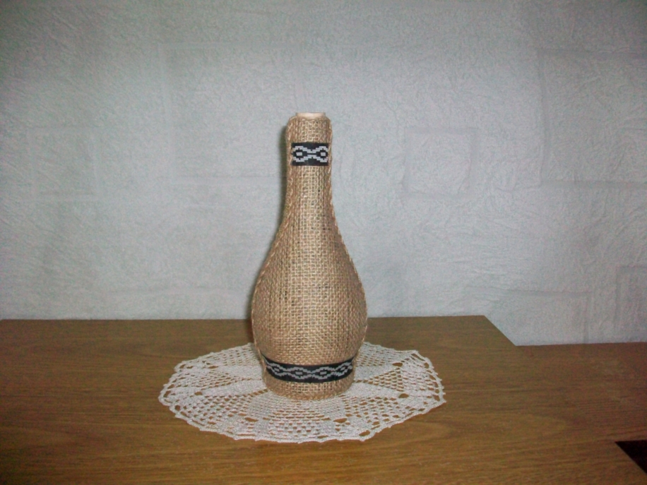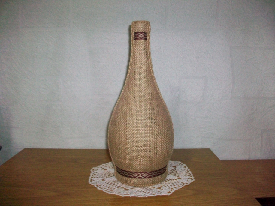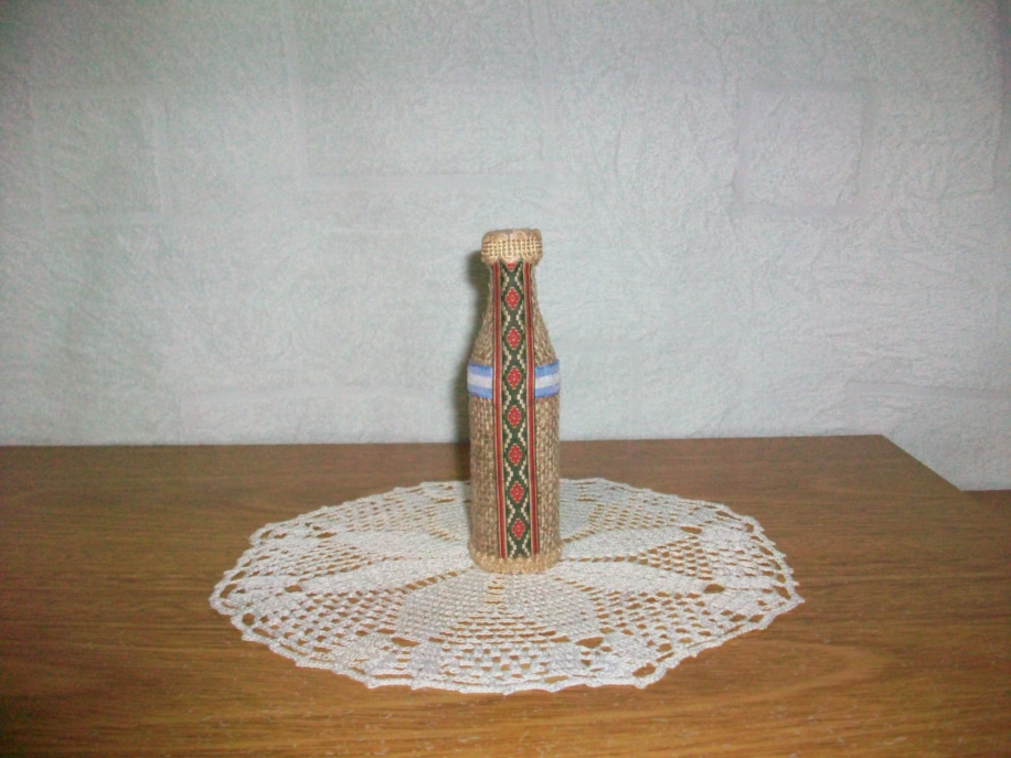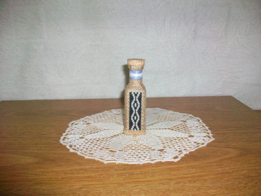 Materiales: Arpillera, adhesivo de doble contacto, figura de decoupage (pintada sobre lienzo con pintura acrílica), cinta de tela con guarda pampa, pasamanería de yute, tapa rosca.