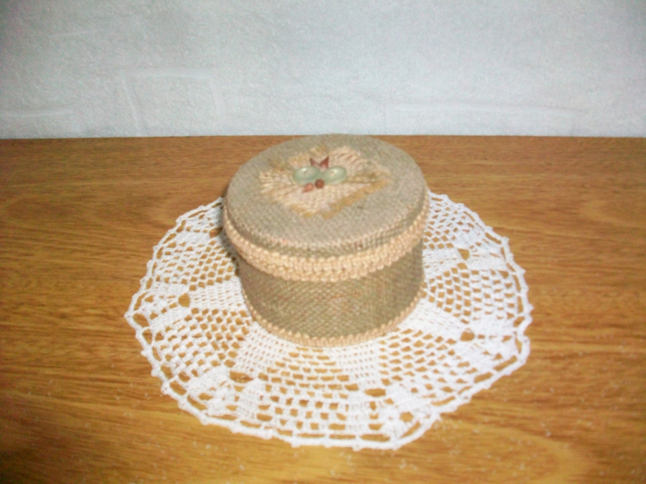 Materiales: Lata pequeña con tapa, arpillera, adhesivo de doble contacto, semillas de eucaliptus secas, botones de plástico pequeños, hilo cordón de yute, cola vinílica, pasamanería de yute.