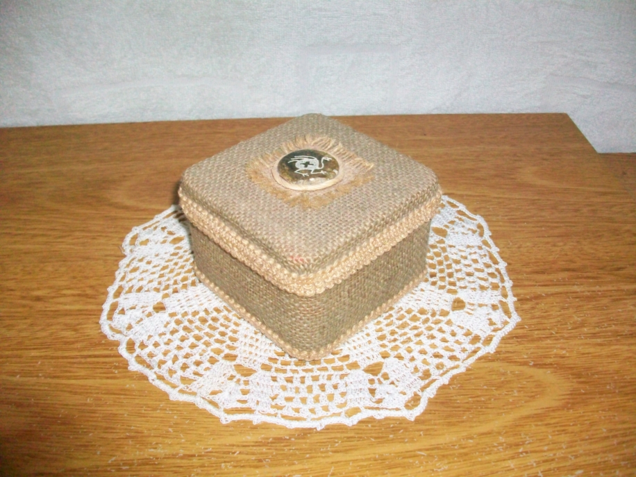 Estuche forrado con arpillera + accesorios 30 julio, 2011Estuches, Forrados + accesoriosMarcia Schütz Estuche forrado + arpillera Pieza: Estuche cuadrado mediano. Materiales: Lata mediana con tapa, arpillera, adhesivo de doble contacto, accesorio circular de piedra sapo con diseño rupestre, hilo sisal, pasamanería de yute. Técnica: Forrado y pegado. Dimensiones: 10 x 10 cm.