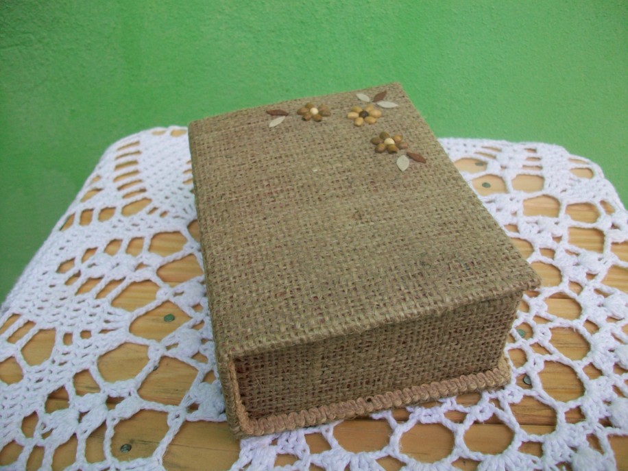 Estuche forrado con arpillera + accesorios 30 julio, 2011Estuches, Forrados + accesoriosMarcia Schütz Estuche forrado con arpillera + accesorios Pieza: Estuche rectangular mediano. Materiales: Caja de madera, arpillera, adhesivo de doble contacto, cuentas de madera para bijouterie, cola vinílica, hojitas de gamuza, pasamanería de yute. Técnica: Forrado y pegado. Dimensiones: 13 x 11 cm.