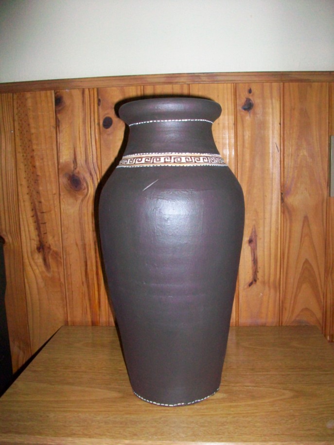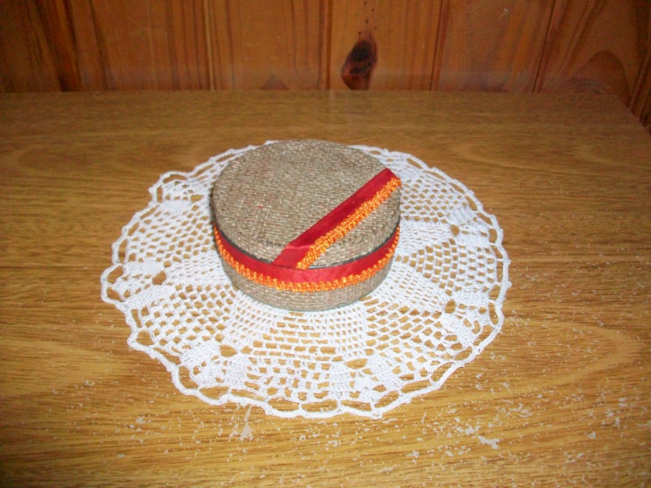 Materiales: Lata grande con tapa, convertidor de óxido, pintura acrílica, figura de decoupage, cola vinílica, cinta de tela con guarda pampa, adhesivo de doble contacto, barniz.