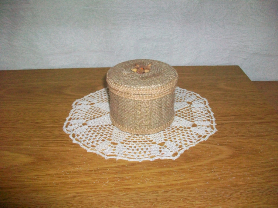 Materiales: Lata mediana con tapa, arpillera, adhesivo de doble contacto, piñitas de pino secas, semillas de eucaliptus secas, cola vinílica, pasamanería de yute.