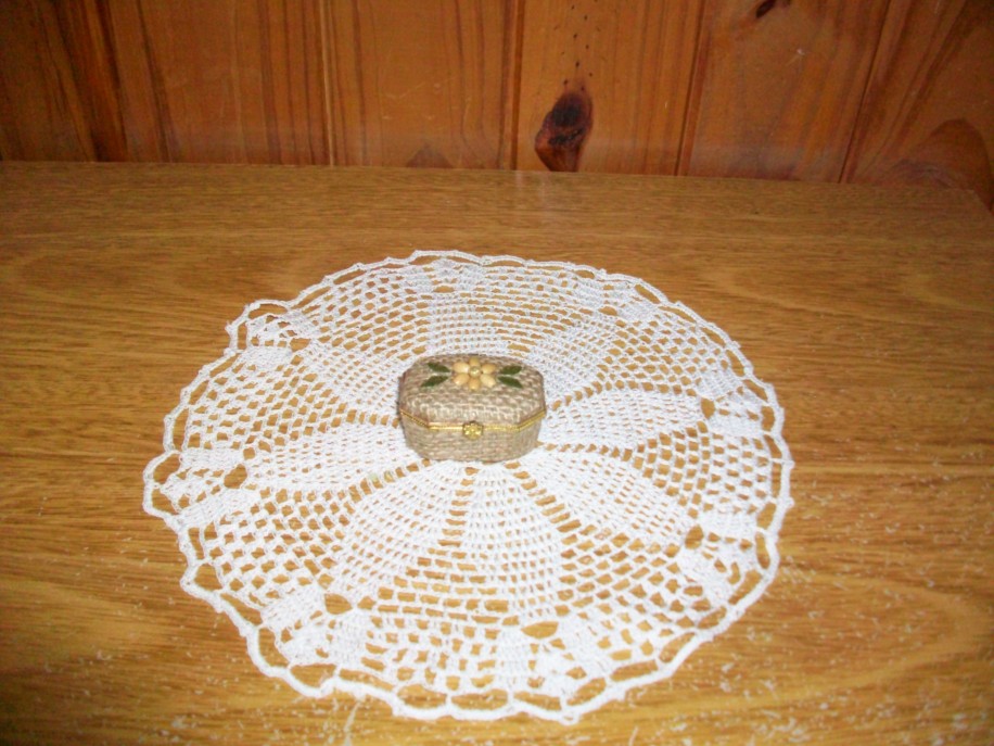 Materiales: Lata grande con tapa, convertidor de óxido, pintura acrílica, figura de decoupage, cola vinílica, adhesivo universal, puntilla de nylon, barniz,